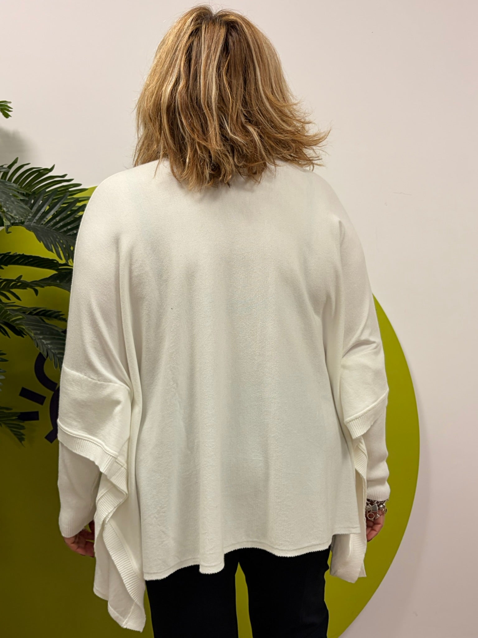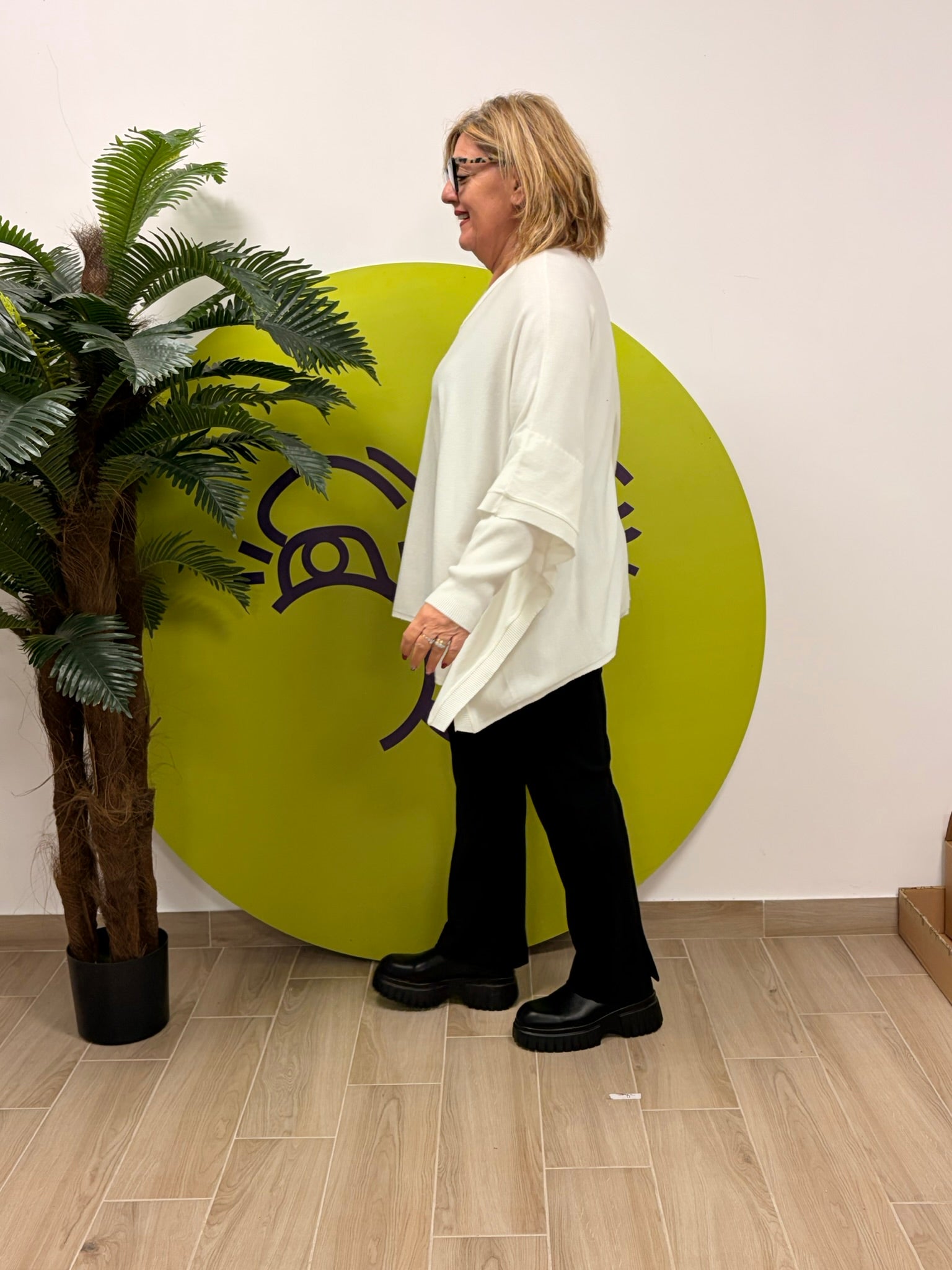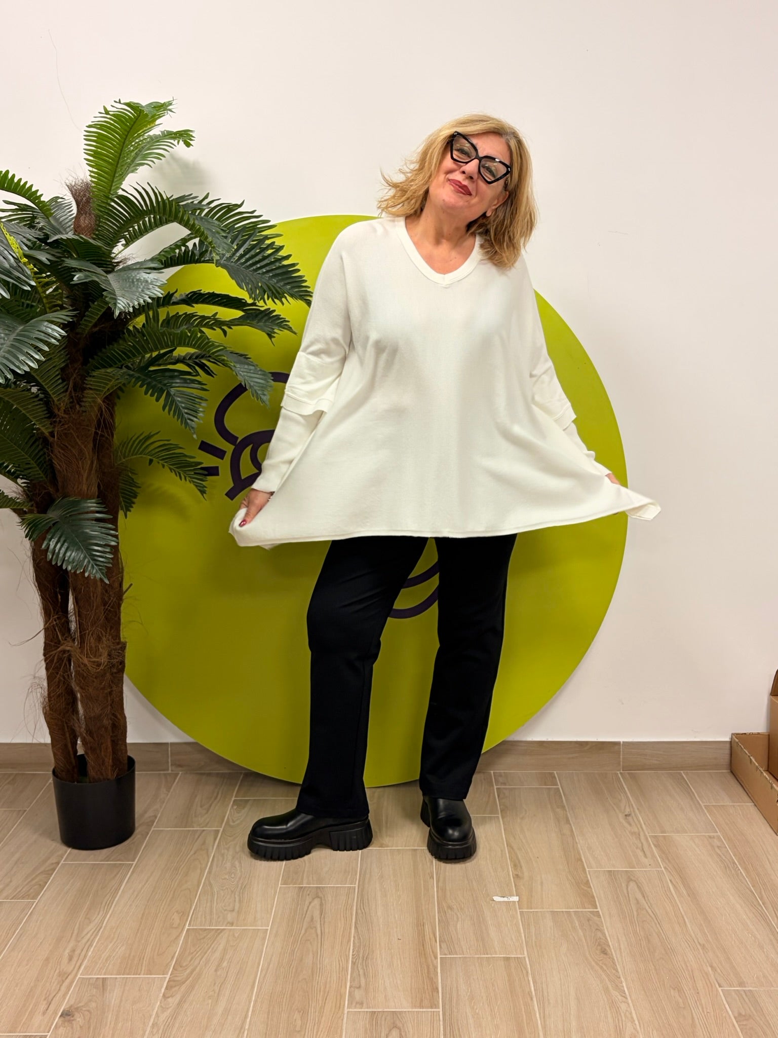 La linea è ampia, fluida, super rilassata: scende morbida sul corpo e accompagna le forme senza mai appoggiarsi o segnare. I manicotti danno movimento e carattere, rendendolo particolare ma facilissimo da portare, mentre lo scollo a V apre la figura e illumina tutto l’insieme ✨