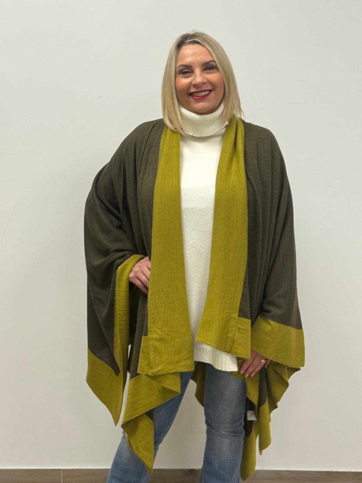 Il design morbido e fluido cade naturalmente sul corpo, valorizzando tutte le silhouette senza costringere. Il gioco di colori a contrasto dona profondità e movimento, rendendo ogni mantella unica e facile da abbinare sia a outfit casual che più ricercati.