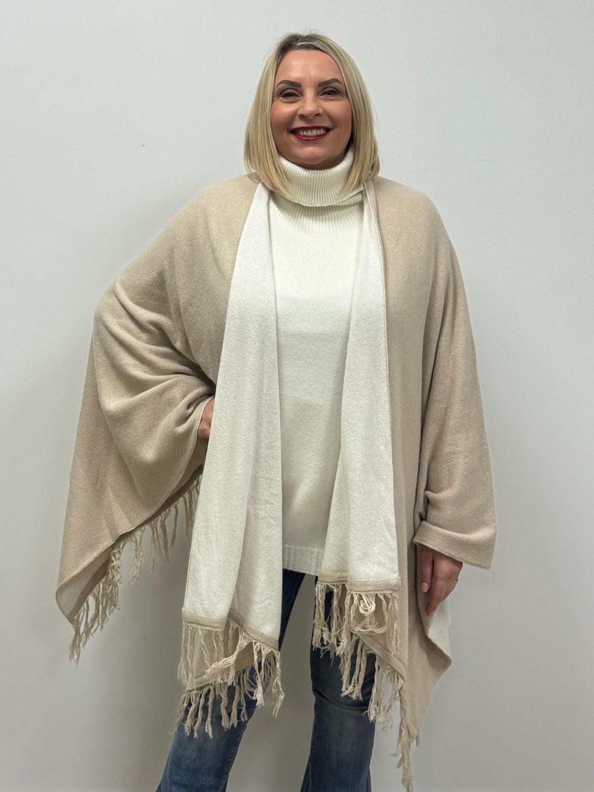 Questa mantella è pensata per avvolgere il corpo con leggerezza e calore, offrendo due anime in un unico capo.
