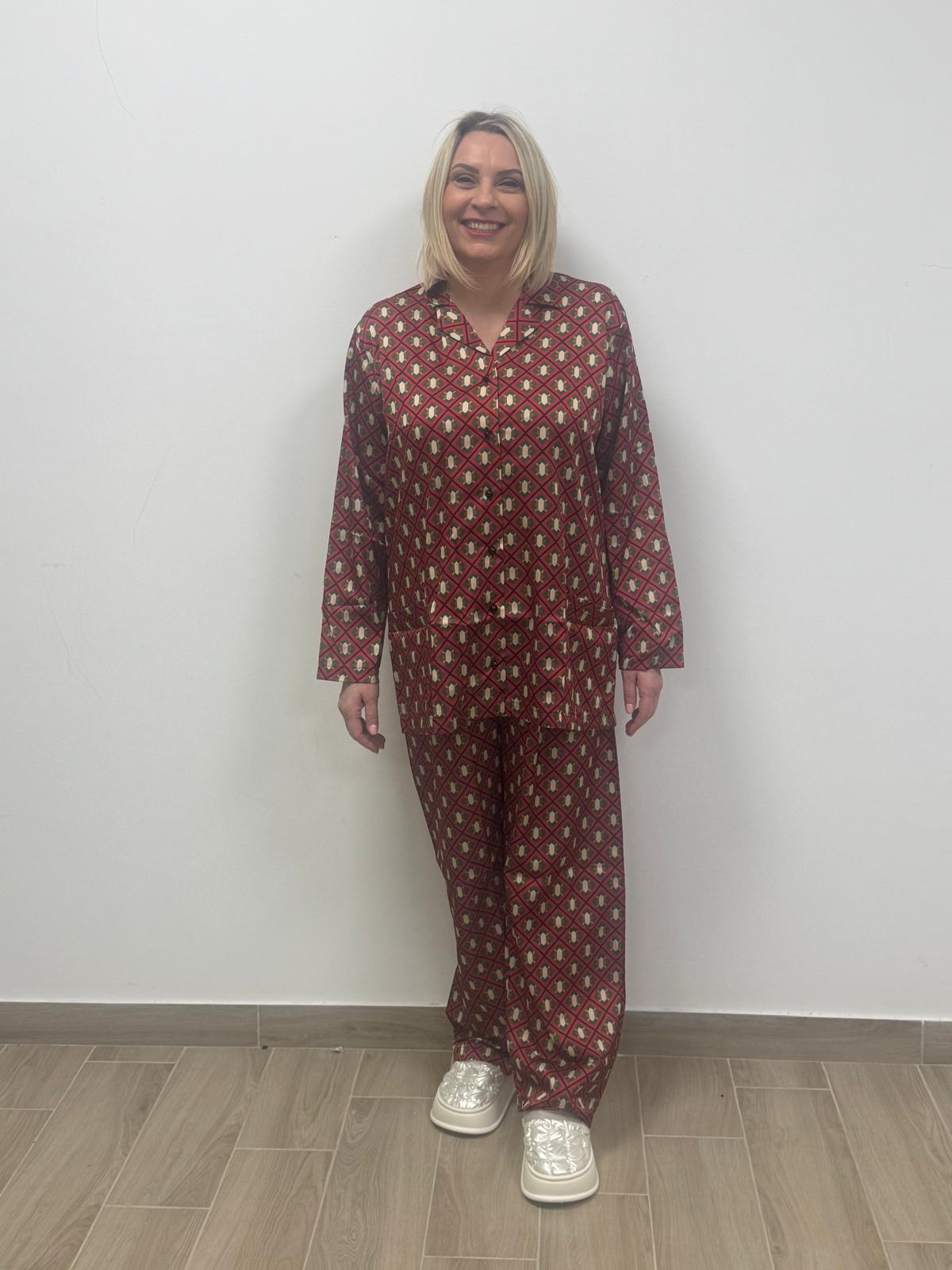La fantasia geometrica e la palette calda e sofisticata rendono questo pigiama raffinato e distintivo, perfetto per chi ama sentirsi curata anche nei momenti di relax. Il tessuto è piacevole sulla pelle e garantisce comfort durante tutta la giornata, dalla sera al mattino.